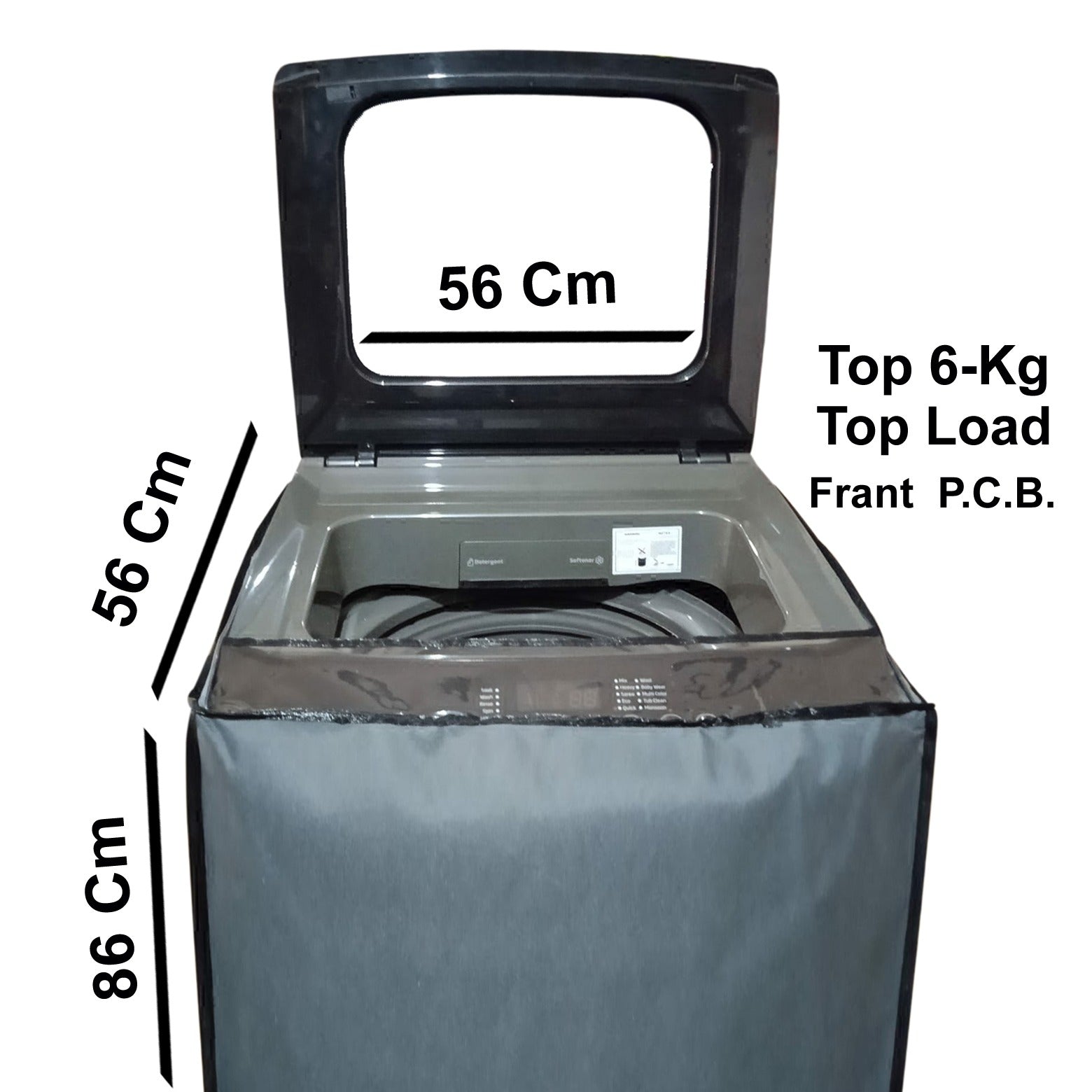 Grey Waterproof Washing Machine Cover for 6 Kg Top Load – Front P.C.B. – 56 x 56 x 86 cm (Dustproof & Protective, Black Border)